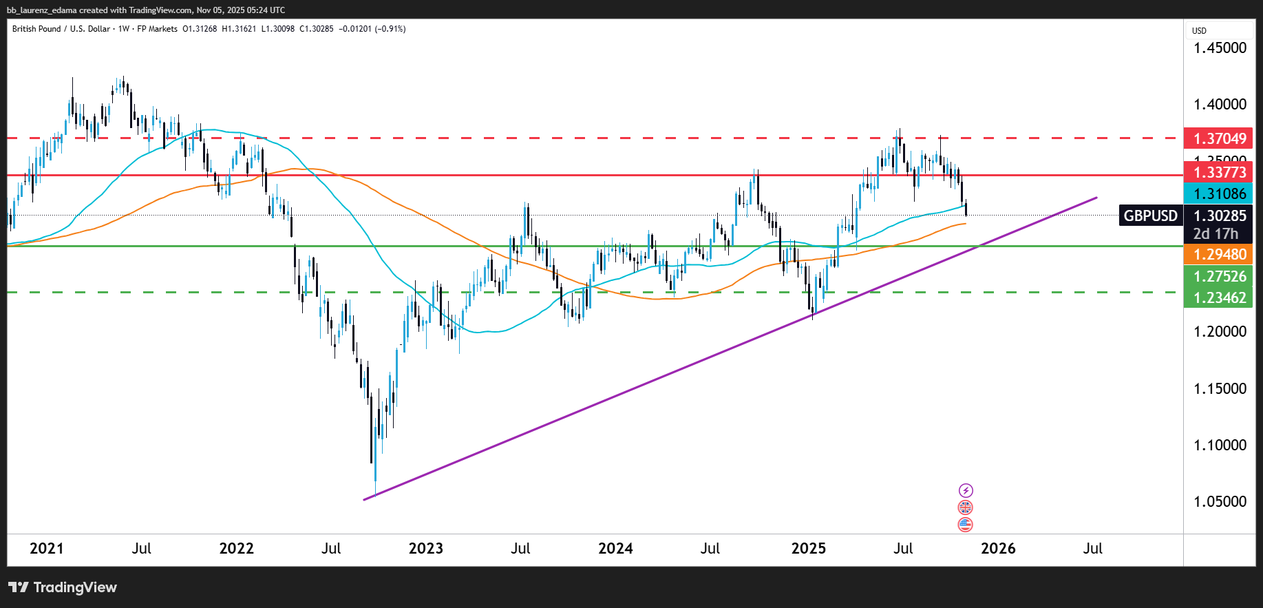 Zooming out to the weekly timeframe, the broader structure shows the pound failing to sustain momentum above the 1.34 handle, a ceiling that continues to reject bullish attempts.