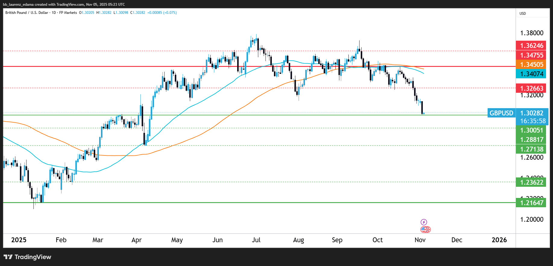GBP/USD continues to trade under pressure after several weeks of steady downside movement. Price is currently sitting on the 1.3020–1.3050 support region, a level that has repeatedly acted as a reaction zone throughout the year.