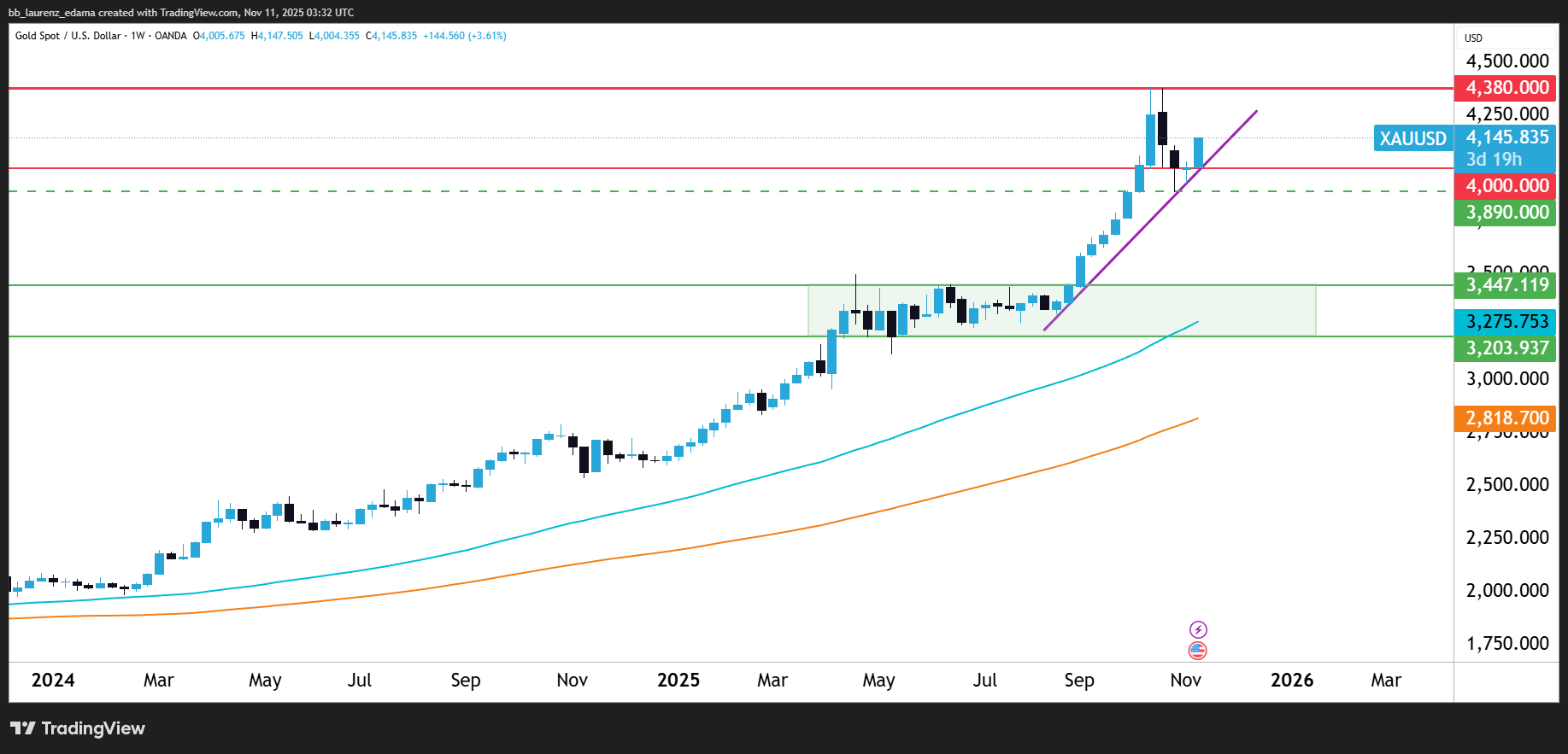 Gold continues to defend the $4,000 support region after a multi-week pullback from its recent all-time highs.