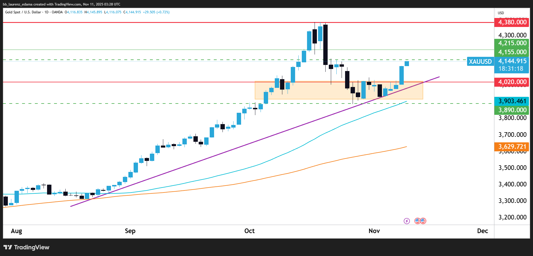 On the daily timeframe, price is now climbing back above short-term structure, aiming toward the $4,155–$4,215 resistance pocket. This level previously capped bullish attempts, so this is where momentum will be tested.