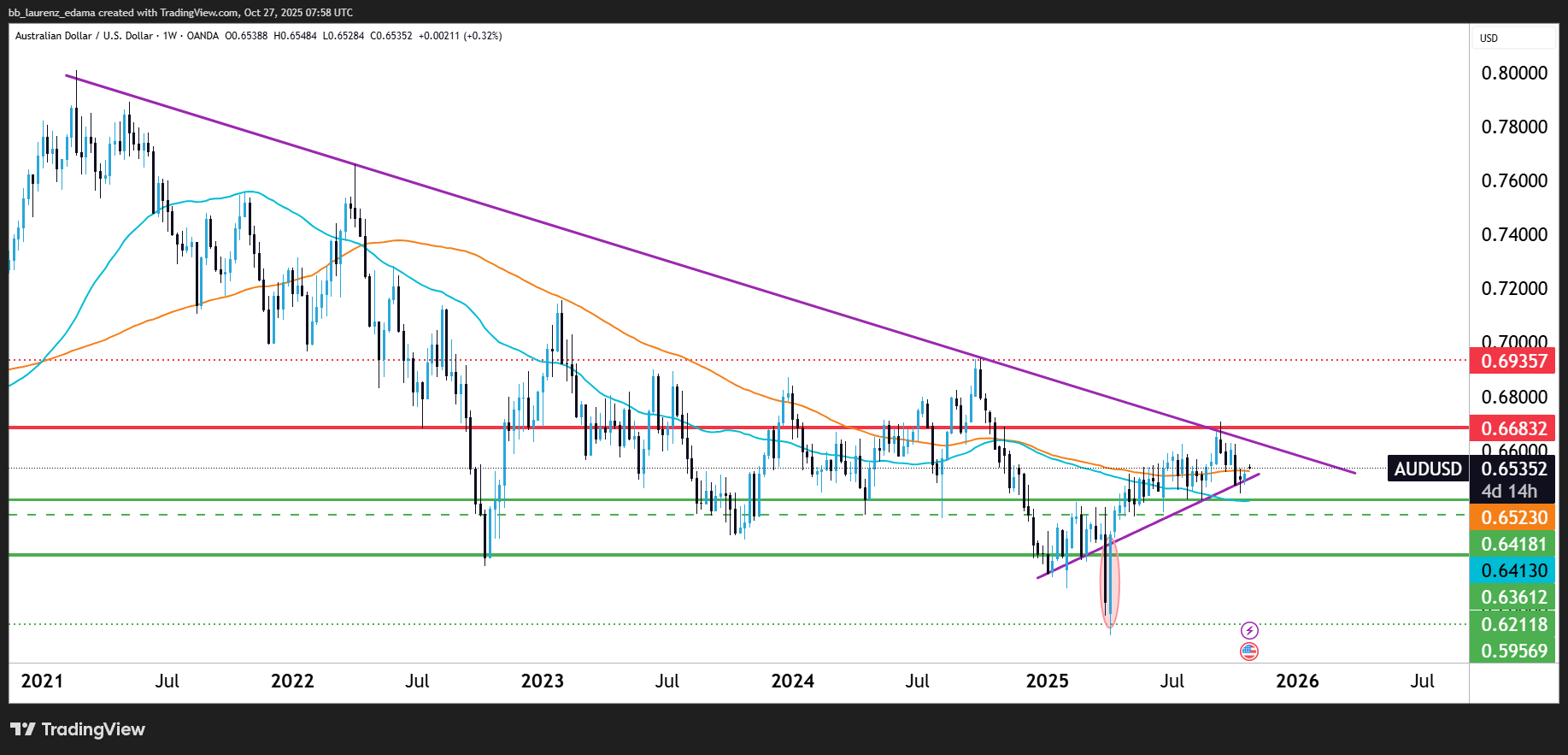 The Aussie is holding support, but trendline resistance dominates the bigger picture. Bulls need a clear break above 0.6680 to confirm momentum; otherwise, pullbacks remain more likely, especially if risk sentiment softens.