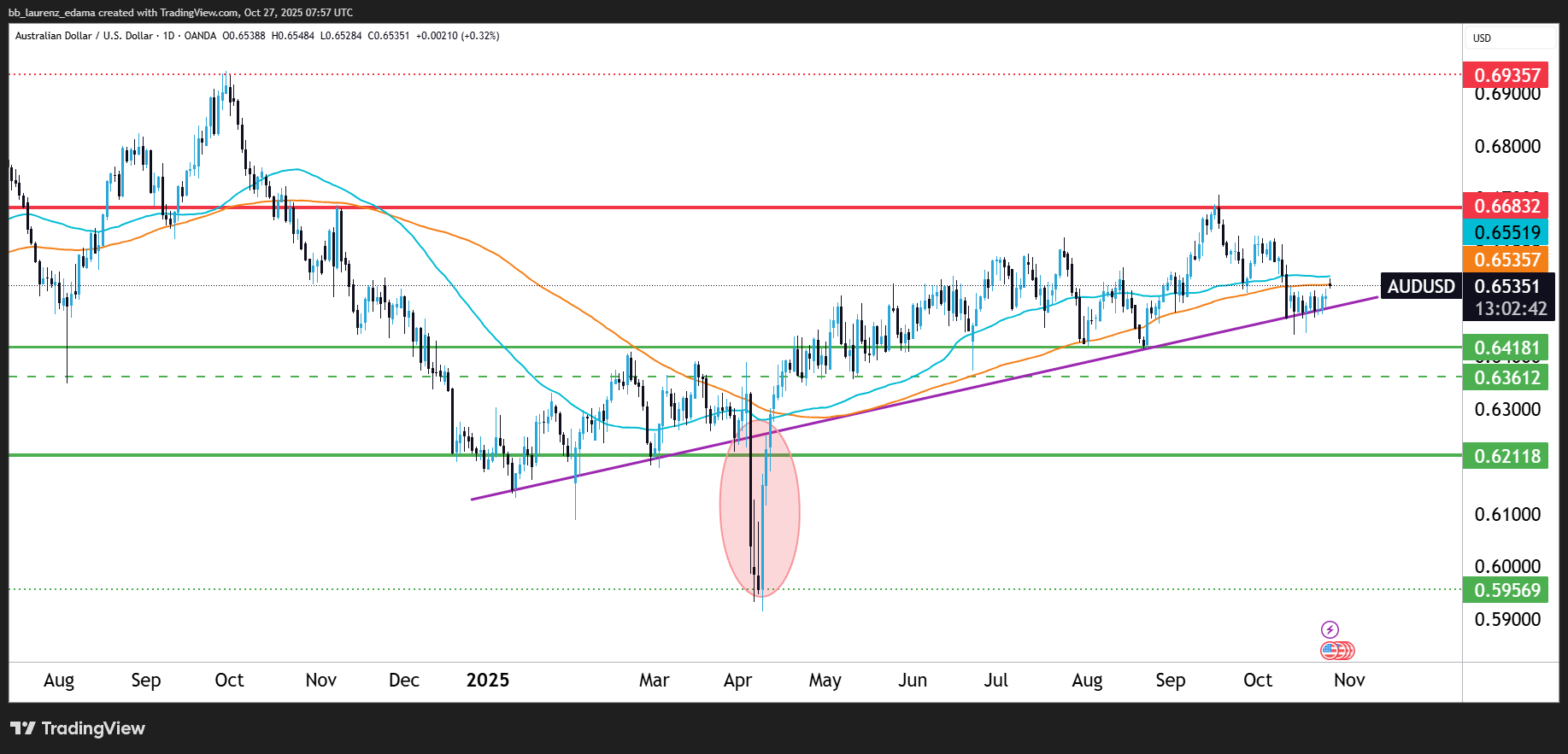 The 50-day and 200-day SMAs sit close together, reflecting a market without strong directional conviction. As long as AUDUSD holds above 0.6415, buyers still have a structural advantage in the short term.