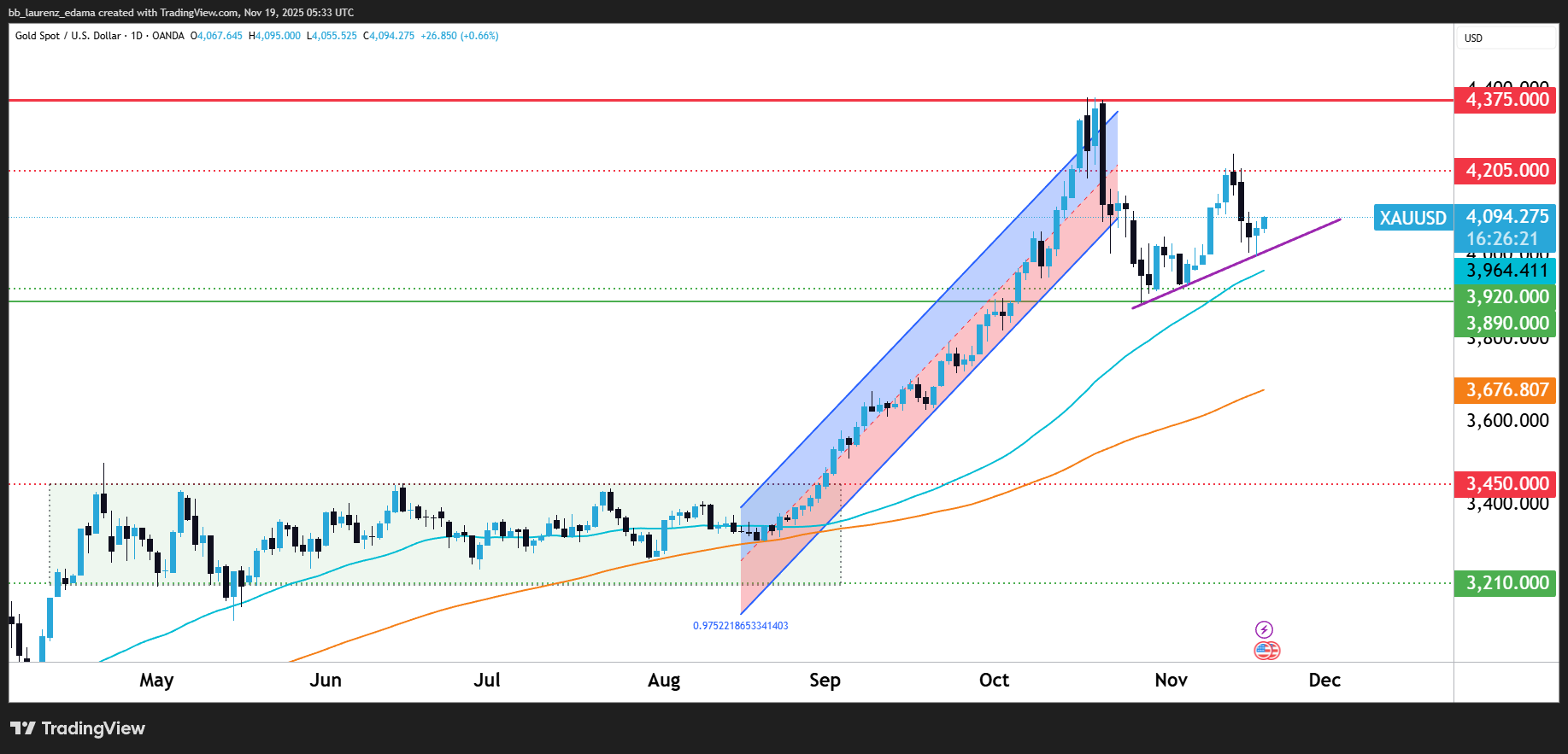 The overnight slump in U.S. equities reminded traders that the economy isn’t as stable as the headlines suggest. That weakness has kept the dollar soft during Asian hours, helping gold hold above the $4,070 area. Add ongoing geopolitical risks, and safe-haven demand quietly supports the metal underneath.