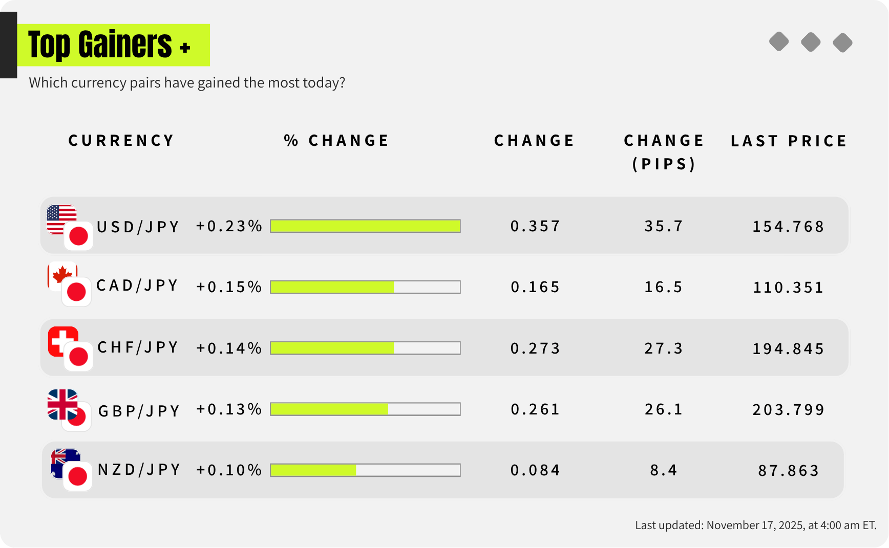 My currency strength meter highlights these currencies as the strongest as of last week: