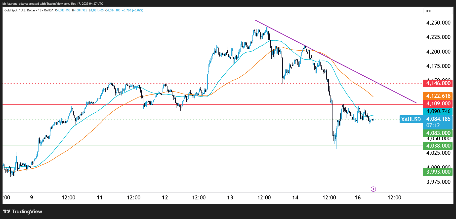 Gold is stuck under a clear 15m downtrend line after last session’s sharp drop. Bulls are trying to hold the 4,083 support, but momentum is still leaning bearish as long as price stays below 4,109 and the descending trendline.