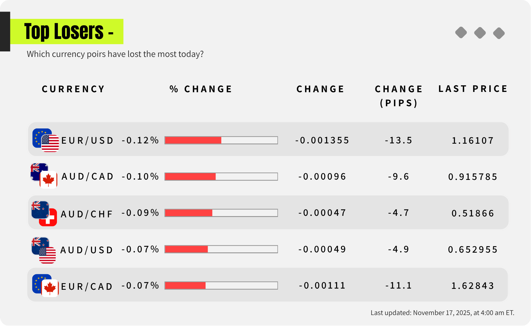 Looking at the opposite side of the strength meter now, these are the weakest of last week: