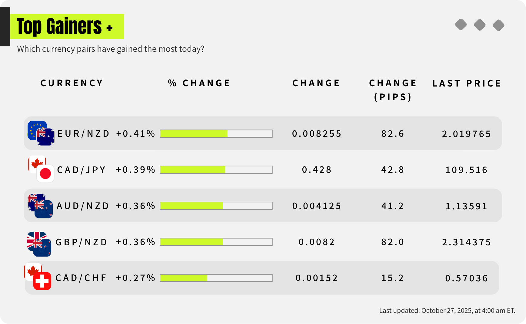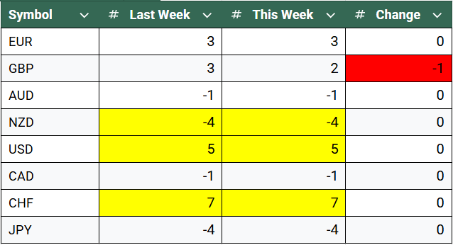 My currency strength meter highlights these currencies as the strongest as of last week: